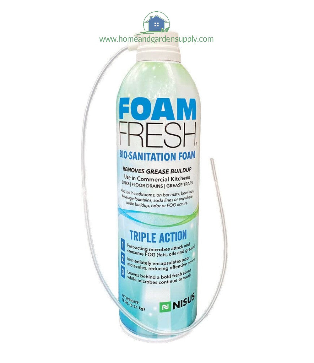 | Application: | For best results apply a liberal coating of Foam Fresh and allow foam to dissipate, which will create a moist surface for optimal conditions. Do not wipe up or clean foam. For drain use, pour 2-3 gallons of warm water into drain openings to moisten drain surfaces before treatment. It is better to apply this product at end of day for overnight action. In kitchens and commercial settings, apply Foam Fresh to organic debris, grease and grime under heavy equipment, floors and floor mats, walls, beverage lines, garbage cans and dumpsters as often as possible to control and prevent lingering odors and organic buildup. Using the extension hose, apply Foam Fresh directly into drains, garbage disposals and other cracks and crevices where organic matter may build. In bathrooms coat the surfaces of urinals, toilets, floors and walls. For other household applications such as carpets, litter boxes, stains, pet odors, washing machines and shoes, spray Foam Fresh liberally on all surfaces where odors might originate. Multiple applications may be necessary for certain surfaces, odors or stains; apply as often as needed. |