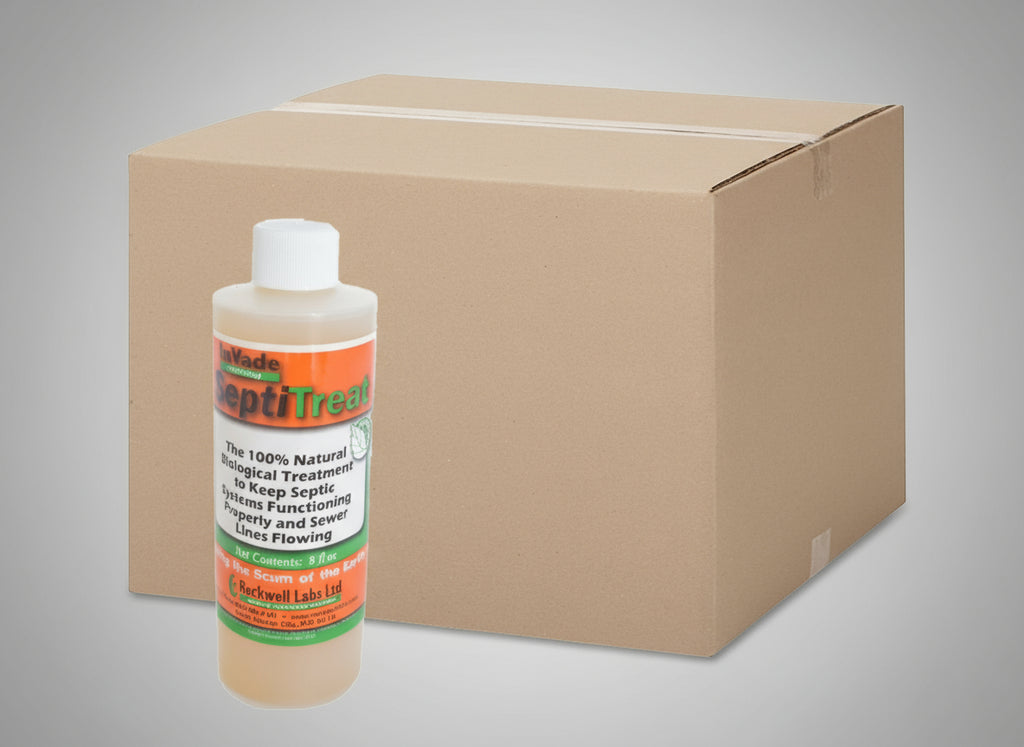 InVade SeptiTreat contains premium natural microbes that digest organic waste, including fats, oils, and grease (FOG), carbohydrates, proteins, cellulose, and urea and reduce odors. Septic systems work by using naturally occurring bacteria to breakdown and liquefy waste. If the system doesn’t work properly, back-ups, lawn damage and foul odors can result. The bacteria in SeptiTreat help replenish the natural bacteria in the septic system that can be overloaded by large amounts of waste, or excessive use of disinfectant chemicals. On a quarterly basis, one 8 oz bottle of SeptiTreat is simply poured into the toilet and flushed. SeptiTreat may also be poured down a drain, followed by about a gallon of water.