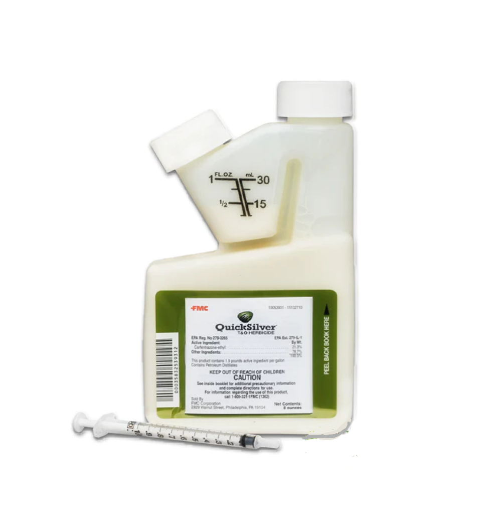 | Application: | Quicksilver Herbicide is mixed at a rate of 0.9 to 2.1 oz. of Quicksilver T&O Herbicide per 20 to 175 gallons of water per acre. Spot treatments are applied at 0.030 fl. oz. in 1 gallon of water per 1,000 sq. ft. |