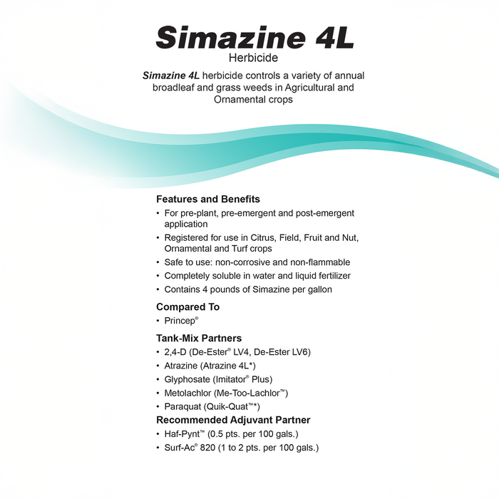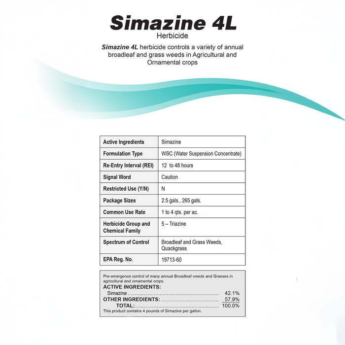 Simazine 4L, a pre-emergence herbicide that provides effective broad-spectrum control of a wide range of annual and perennial grasses, and broadleaf weeds in a variety of crops.